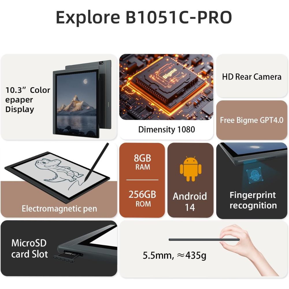 يُعدّ جهاز Bigme B1051C pro الأداة الأمثل للقراء والمبدعين والمحترفين الذين يرغبون في الجمع بين راحة الطباعة بتقنية الحبر الإلكتروني وقوة نظام أندرويد. اقرأ، اكتب، ارسم، أو اعمل – كل ذلك في جهاز واحد.